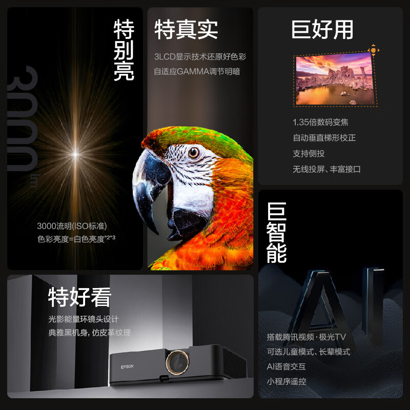 【张艺兴同款】爱普生CH-A100高亮家庭影院智能投影仪(0.62”大芯片 3000流明 1.35倍数码变焦)