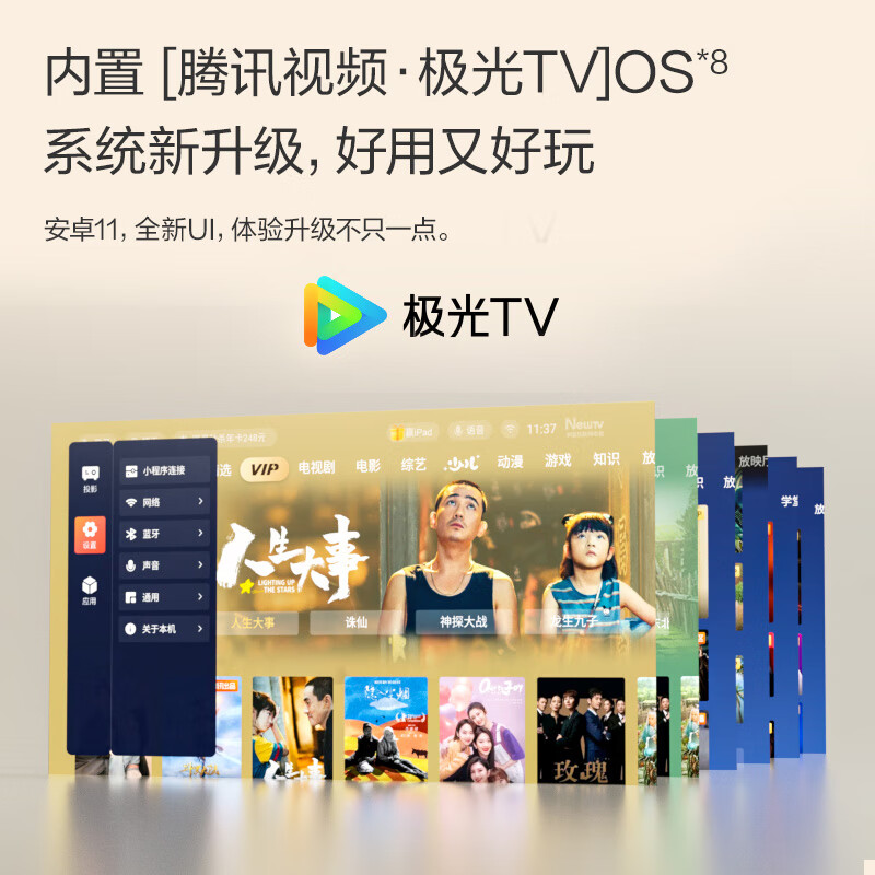 内置[腾讯视频·极光TV]OS系统新升级,好用又好玩。涵盖电影、电视剧、综艺、纪录片、儿童、音乐等各类内容,不间断实时更新。微信可绑定投影机,可一键互联,便捷的智能投影操作体验,新热大片随时看,精彩不错过。