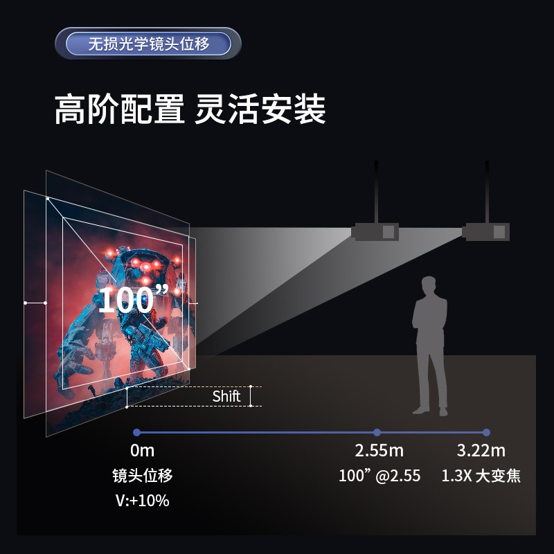 0.65DMD芯片,光学变焦镜头,JBL音响,支持镜头位移+四向校正。