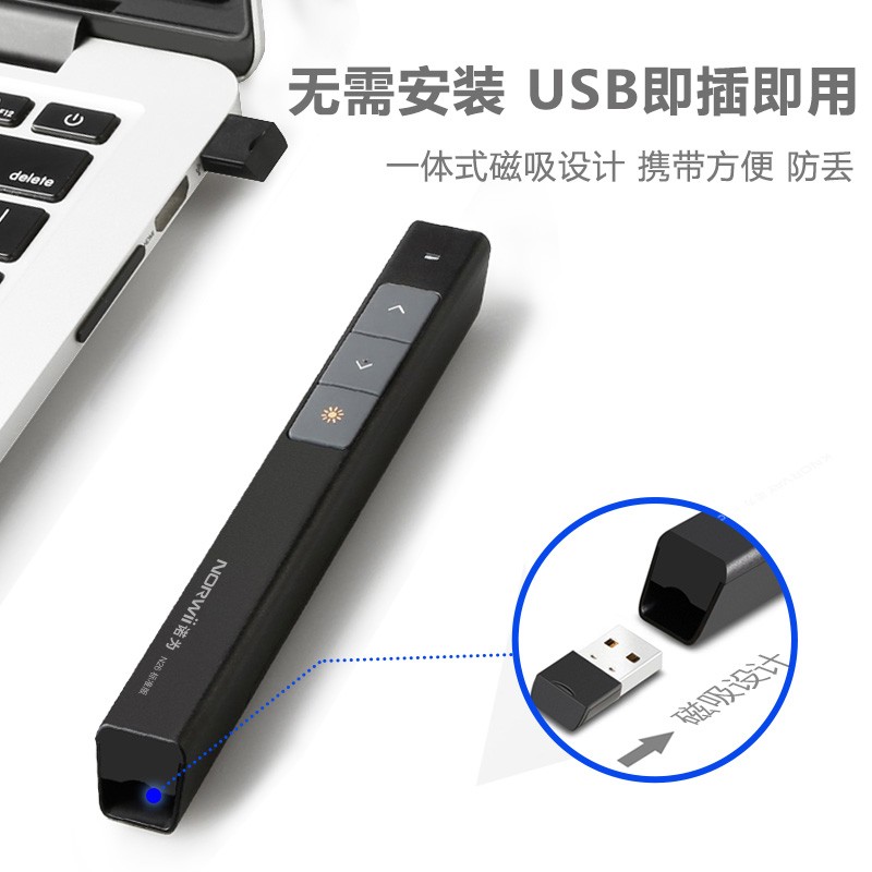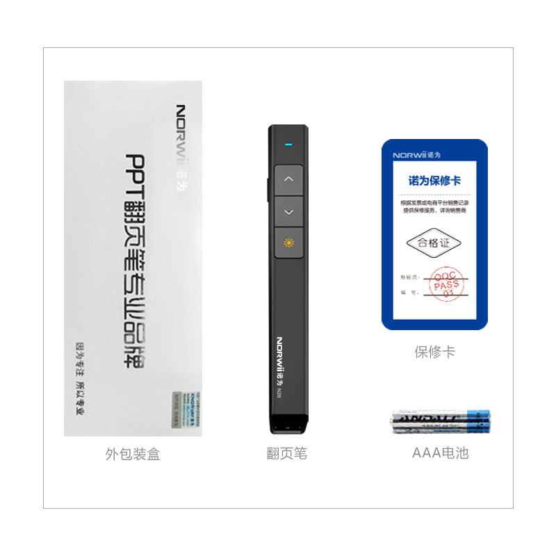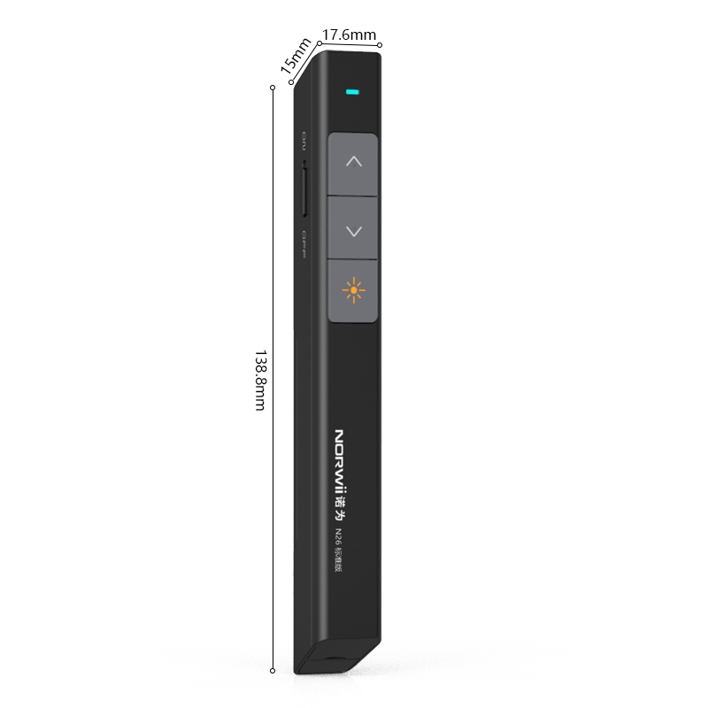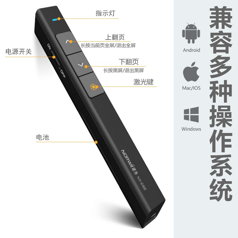 诺为是专业的PPT翻页笔品牌,销量位居行业前端。这款N26C的激光笔已通过激光测试和按键测试,有黑白2色可选,产品内配有优质芯片,使其拥有高穿透性以及高灵敏度。支持Prezi、Microsoft Office、WPS等软件和Windows、MAC、IOS、安卓等系统,无需安装驱动即插即用。特别的是,激光笔上有盲点设计,可防止误操作,让演讲者使用时更专注。外形尺寸24.7*13.8*5.14mm,用 7号电池。