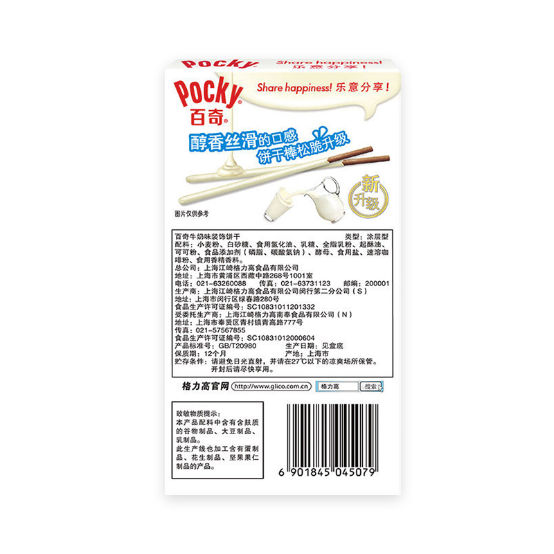 格力高(glico)这款百奇牛奶味装饰饼干,配料选用小麦粉、全脂乳粉等。饼干棒表面具有白色巧克力涂层,口感甜而不腻。独立小袋包装,便于携带,开袋即食。保质期为12个月,请置于27℃以下凉爽处保存,避免日光直射。
