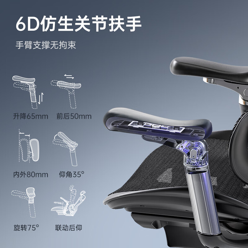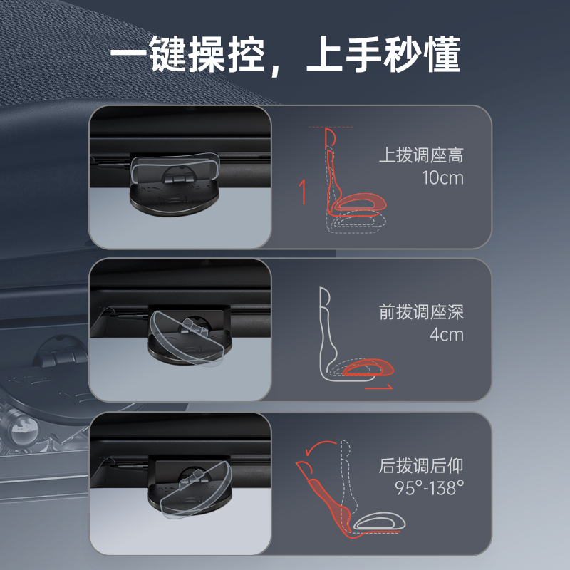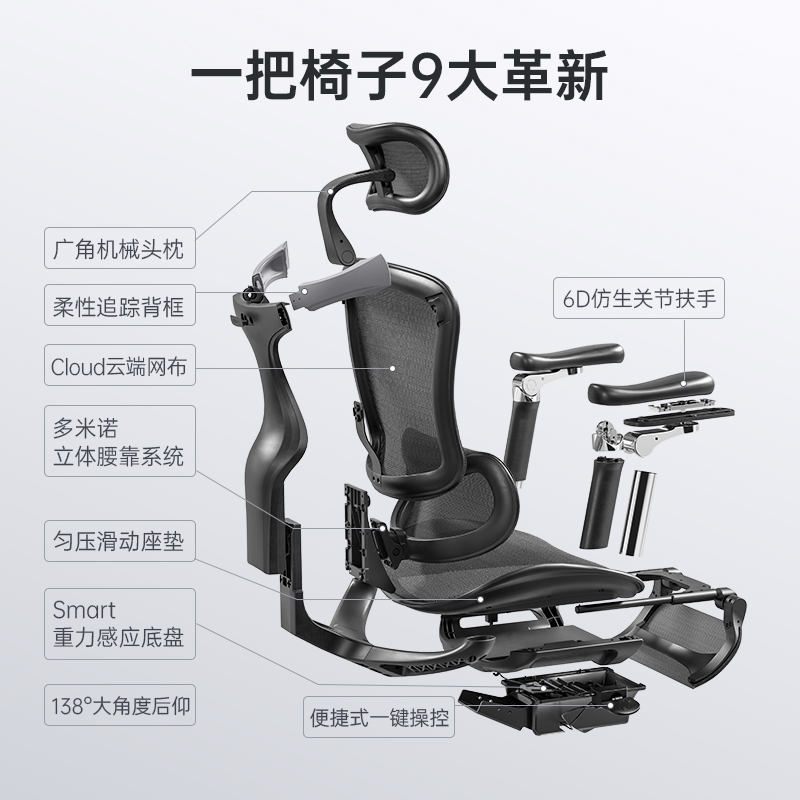 将横向、纵向、竖向三个影响舒适与健康的变量设计成三个模块集为一个腰枕,并让腰靠与座垫、椅背连同身体形成一个连锁式撑腰系统,无论使用者是正坐还是后躺,腰靠都能做作相应的力度与位置的变化,真正做到户腰如影随行。