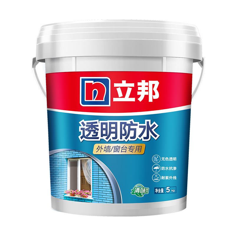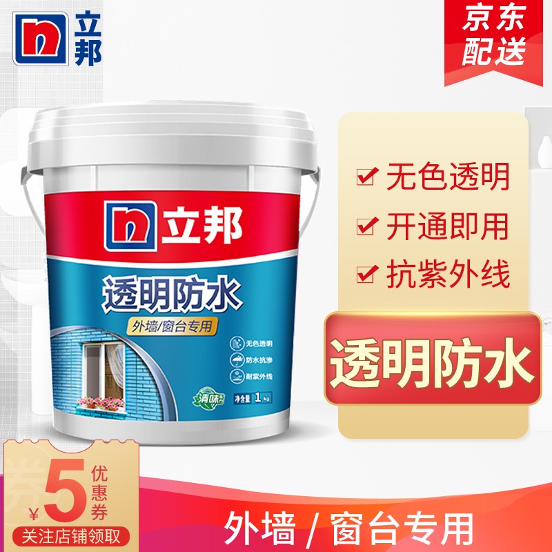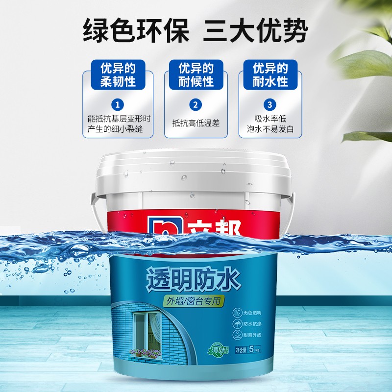 立邦透明防水胶,防水涂料,适用于外墙、窗台、厨卫墙面、屋顶防水补漏等,免砸砖,耐水耐磨,透明堵漏胶,晶透成膜,遇水不白,不影响美观 ,一刷止漏、无色透明、抗紫外线、防水抗渗、开桶即用。