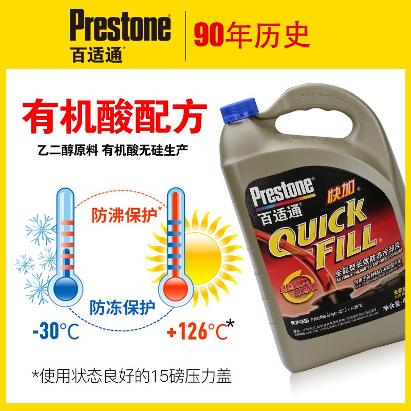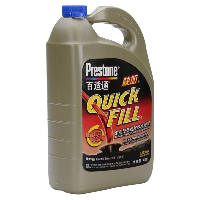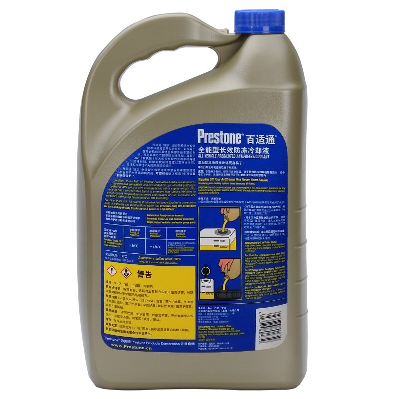 Prestone百适通是美国Honeywell霍尼韦尔旗下的汽车用品品牌。AF2045,该产品不含磷酸盐、硼酸盐和硅酸盐,采用了特殊的化学组分和配方技术,延长了腐蚀抑制制的寿命。 一般情况下防冻液的冰点应选择在当地环境条件冬季最低气温减去10°C至15°C左右。像这款 -30°C的防冻液,可以应付北方绝大部分地区,支持可以与其他防冻液混加这点,也比较方便。