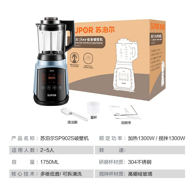 苏泊尔(SUPOR)这款型号为SP902S的破壁机采用精钢可拆卸刀座,5秒拆装,方便清洗,加热功率1300W,搅拌功率1300W,配备八种研磨程序,杯体采用高硼硅玻璃材质,容量为1.75L。