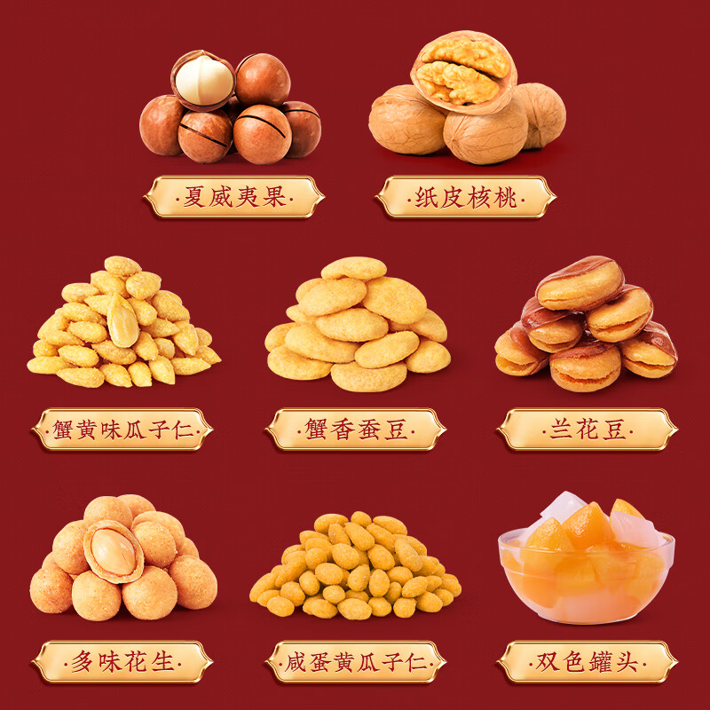 三只松鼠 坚果大礼包采用从全球各地采购的优质原料,精挑细选、精益加工,25段控制层全天实时监测,确保每口都安心,提供多种每日所需营养。坚果大礼包内含8袋,共1543g,分别是碧根果120g+纸皮核桃120g+蟹香蚕豆205g+多味花生265g+兰花豆205g+蟹黄味瓜子仁218g+双色水果罐头300g+咸蛋黄味瓜子仁110g。