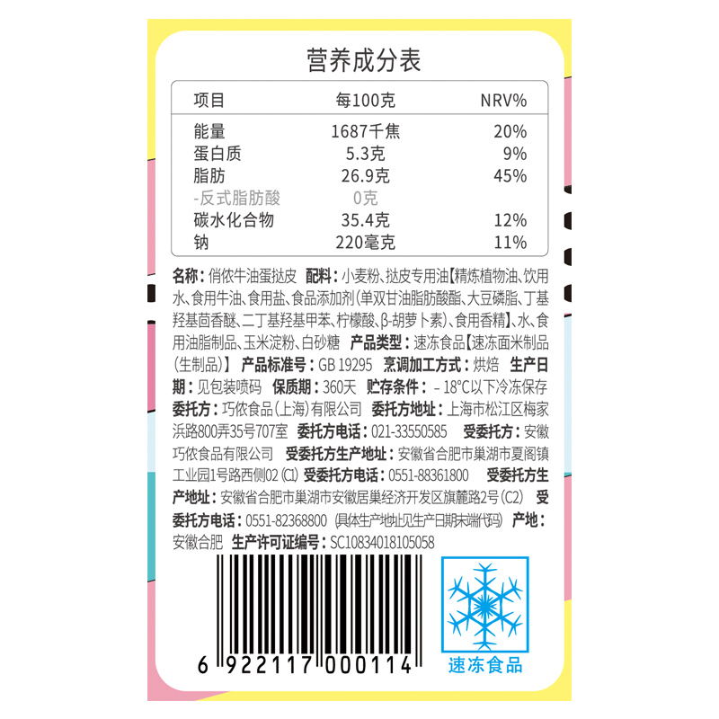 俏侬食品有限公司是一家生产西式冷冻面点的公司,主要做泡芙馅、泡芙坯、蛋挞皮、冷冻面团(法式酥皮、披萨饼底、手抓饼)等产品,旗下拥有俏侬、巧奇等品牌。这款牛油蛋挞皮使用澳洲小麦粉、牛油酥油及天然无水奶油制作,不含反式脂肪。规格:1020g。