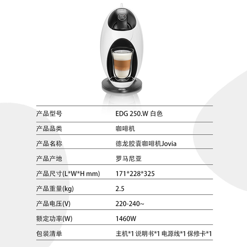 德龙(Delonghi)咖啡机 欧洲进口 15bar泵压 意式美式 胶囊Jovia 小龙蛋 冷热花式饮品 EDG250.W 真我白