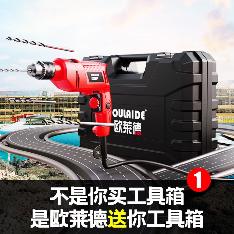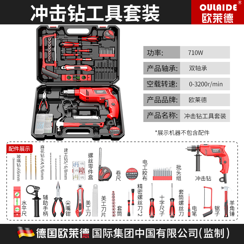 德国欧莱德家用手电钻冲击钻多功能两用轻锤组合维修套装电动螺丝刀充电钻车载木工电工五金工具箱套装 店铺推荐:冲击钻万家福轻盈版【插电款】
