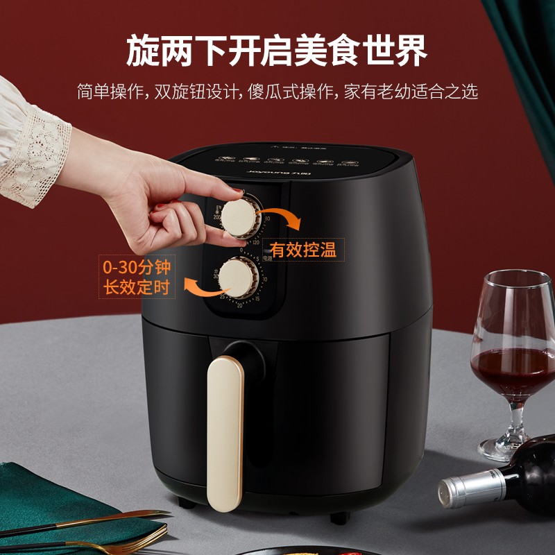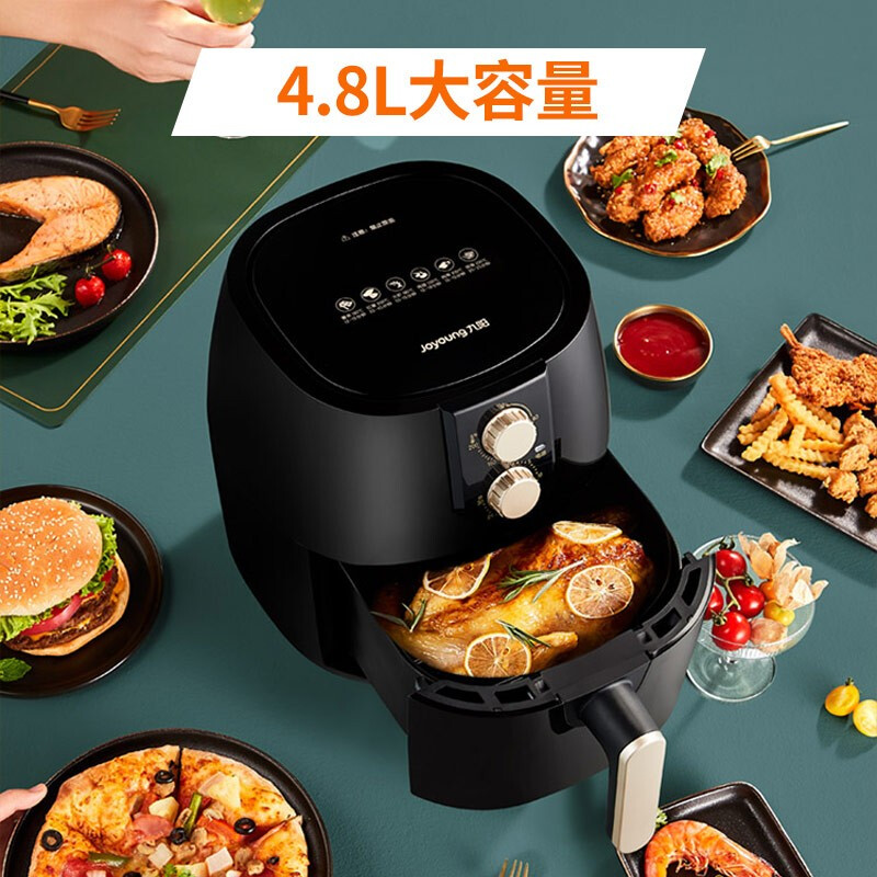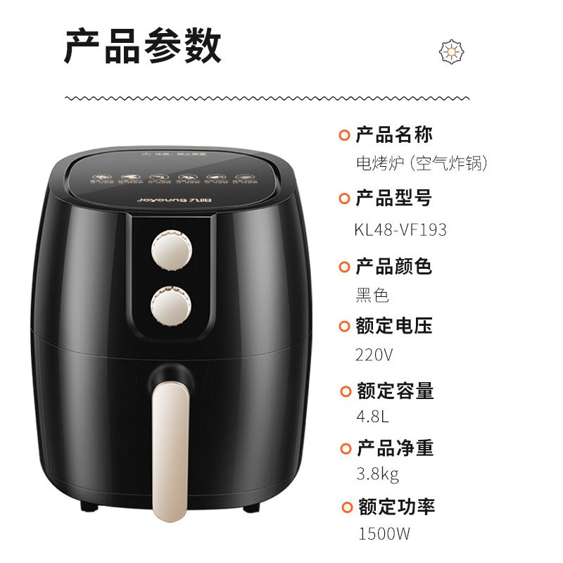 Joyoung九阳KL48-VF193空气炸锅,4.8升大容量,一机炸烘烤,不止能炸,更能烘能烤,双旋钮操控,360度导风风道,1500W大功率,易洗易拆不粘,分拆设计,清洗无忧,NTC温度传感器,恒温受热,精准控温,延时散热2分钟,机器耐用,美味久享。