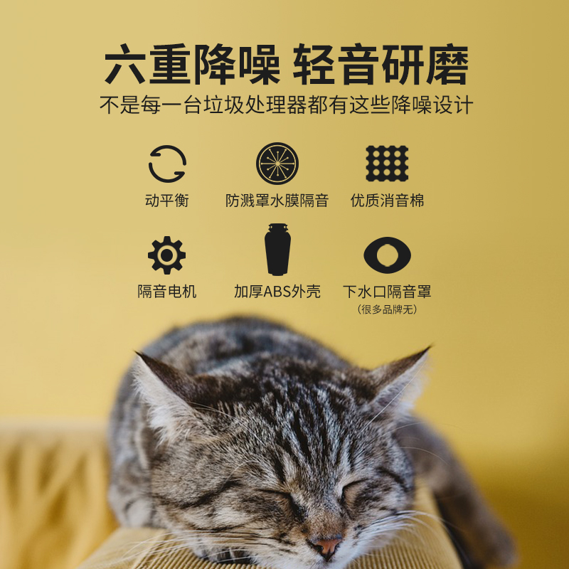 荣事达(Royalstar)垃圾处理器LD760-S6,2021年3月上市。产品采用触控操作的无线开关,免打孔安装。具备全自动智能关机功能,处理完毕后自动关机,不用担心腔体有没有研磨完,避免电能浪费,使用非常轻松。电机为760W,3800转高性能PMDC直流电机,超过1马力,电机采用集成一体式设计、双滚珠轴承、5mm电机机壳,性能强劲而且噪音小,垃圾研磨范围覆盖更广,硬软不怕。研磨系统升级可以处理纤维垃圾的双层研磨盘系统,研磨盘下方隐藏设计四叶旋风飞刀,每分钟15200次切割,保证了研磨细腻度,无刀片合金镀铬研磨锤安全耐用。1.43L超大研磨腔,腔体抗菌率达到99.9%。升级为六重降噪,特别增加了下水口隔音罩更安静,这款声音比较小。可链接洗碗机。这款产品颜色比较独特,国潮绿,质感工艺很强。