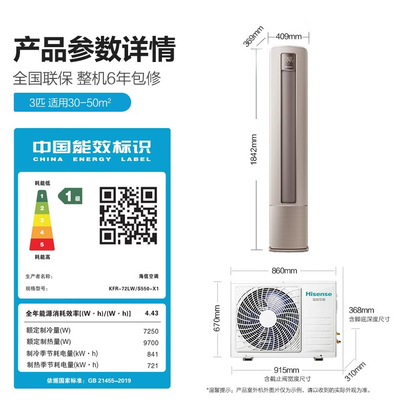 海信(Hisense)净呼吸大风量空调 新一级能效变频冷暖 分区送风自清洁低噪柜机圆柱式空调立式客厅 3匹KFR-72LW/S550-X1【0元安装】