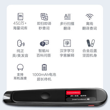 有道词典笔第二代 加强版,一扫即翻效率很高,离线也能翻译,收录超过230万权威词条,包括小初高、大学,还有托福、雅思、GRE等词汇。支持中英互译。可以扫描单词,也可以扫描整句,可多行扫描翻译。标配高灵敏度电容触摸屏,终生持续更新,支持蓝牙及Type-C连接,重约60g。