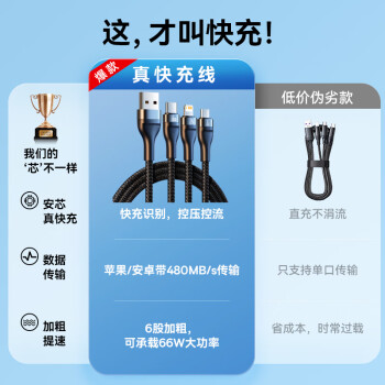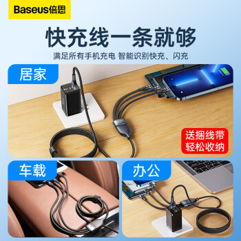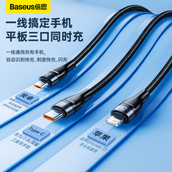 倍思 数据线三合一充电线6A快充66W充电器线 适用苹果14/13/12小米华为Type-c安卓手机多头一拖三车载 黑
