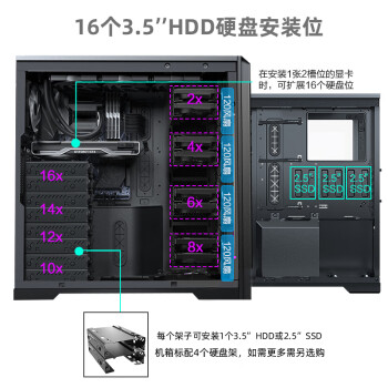 兼容SSI-EEB到ITX全尺寸主板,支持双系统、双电源安装,可加装480mm冷排及475mm显卡(竖装),拥有3.5英寸HDD硬盘位*12、2.5英寸SSD硬盘位*11,以及15*120mm/8*140mm风扇位,双重防尘设计,尺寸为560*580*240mm。