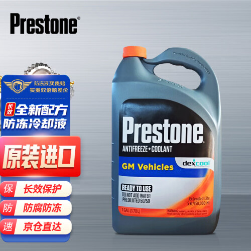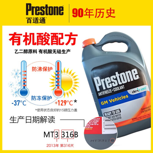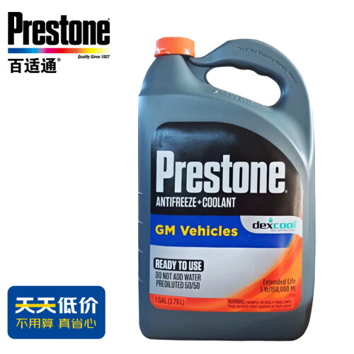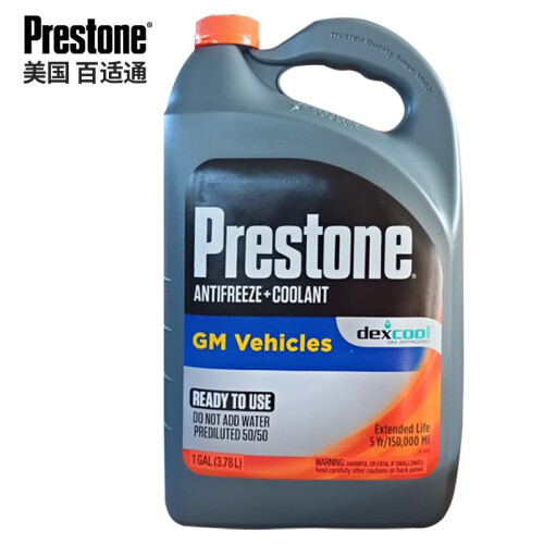 Prestone百适通是美国Honeywell霍尼韦尔旗下的汽车用品品牌。这款产品编号为AF850的预稀释长效防冻冷却液,适用于所有要求使用通用汽车DEX-COOL防冻液的车型,并且达到了主要汽车制造工厂灌装防冻液的品质。
