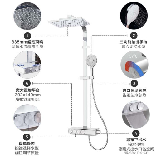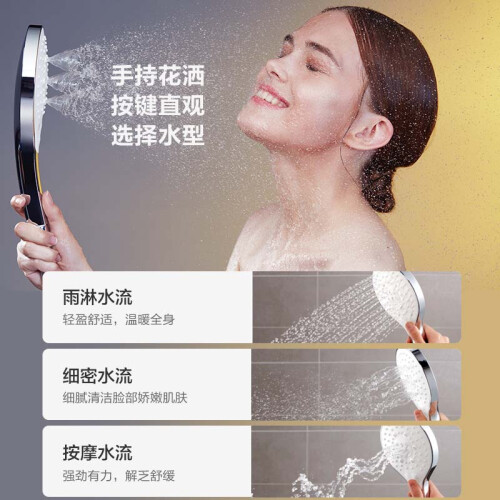 该款手持花洒,雨淋式、风暴式、按摩式出水可调。还有瀑布式下出水,适合浴缸实用,平时接水也更快速方便。302*149mm宽大置物平台,随手放置淋浴用品,拿取更方便。