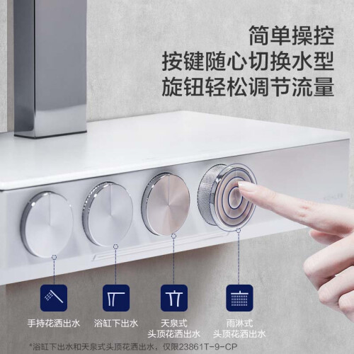 该款采用机械恒温阀芯,根据水温变化,可在0.2秒内稳定水温,保证最小水温波动,给宝宝洗澡时也不无需担心。搭配直觉操作按钮,4按键,分别代表手持花洒出水、浴缸下出水、天全式顶喷花洒出水、雨淋式顶喷花洒出水。其中浴缸下出水、天全式顶喷花洒,仅限该款拥有,通过一键准确控制出水模式,轻按后轻松切换。