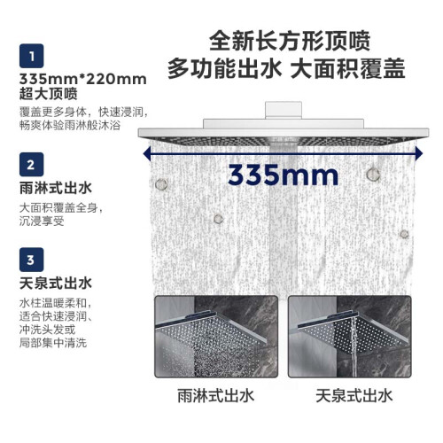 335mm全新长方形顶喷,亲氧水流技术,让水珠轻盈饱满。尤其是该款特有的天全式顶喷出水模式,水流柔和包裹全身,洗发时快速亲润头发,局部清洗时,也能感受到全身温暖。
