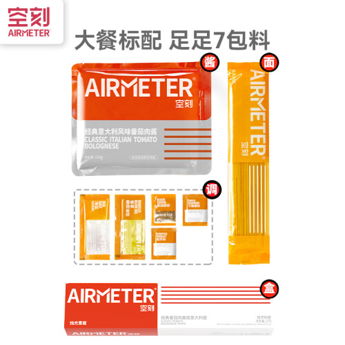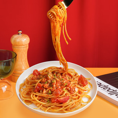 空刻这款番茄肉酱意面,由意面、调料包、酱包组成。酱汁选用猪近脊肉部分与新鲜番茄汁慢炖而成,色泽红亮,番茄香味浓郁。煮熟后香味浓郁,意面口感酸鲜爽口,富有嚼劲。独立小袋包装,方便保存。保质期为9个月,建议在常温、阴凉、干燥处保存。