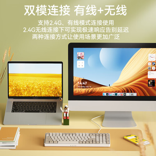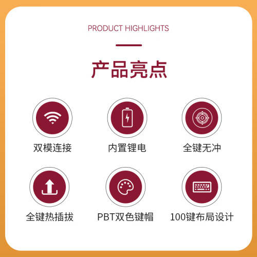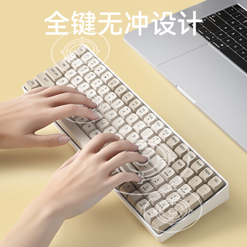 A100系列拥有黑糖色、奶咖色两种配色,并可选K黄轴、青轴。100键紧凑式布局,2.4G、有线双模式连接,PBT双色键帽,舒适手感,经久耐用不打油,并支持全键热拔插,全键无冲。内置1200mA锂离子充电电池,约90天使用时间。支持多系统使用。