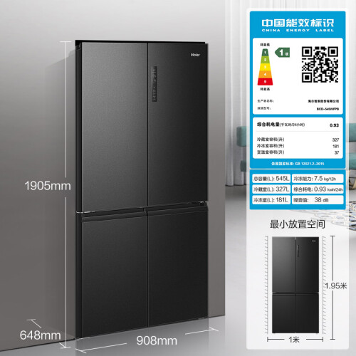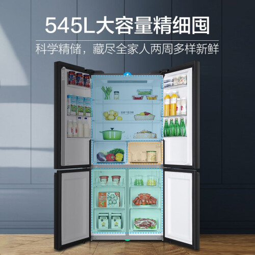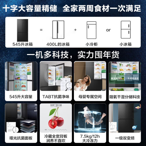 海尔 星蕴系列 BCD-545WFPB 风冷十字对开门冰箱采用磨砂抗菌面板,带来温润和哑光质感,材质环保健康,更加耐磨抗指纹。拥有545L大容量,其中冷冻室181L,冷藏室327L,变温室37L,含门厚度仅有648mm,方便嵌入柜体。采用压缩机+风机双变频设计,实现精准控温同时更加省电静音。24小时综合耗电量0.93kwh,冷冻能力为7.5kg/12h,符合一级能效标准。搭载T·ABT杀菌净味,天然碧玺释放负离子和纳米银离子,去除异味,实现99.99%杀菌率。
