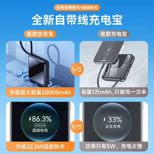 华为通用充电宝自带线30000毫安时66W大容量移动电源TypeC超级快充22.5W苹果手机20W超薄小巧便携ZJEV