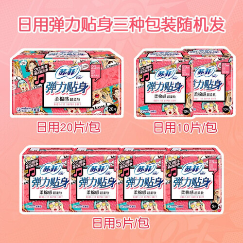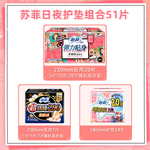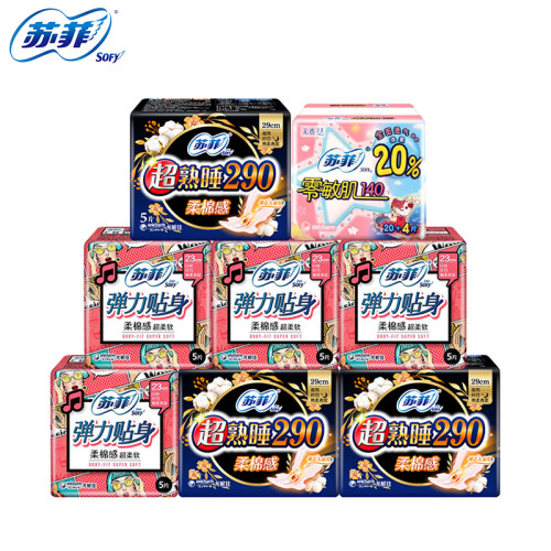 苏菲卫生巾,于日本开发,是尤妮佳公司针对现代女性推出的卫生巾品牌,提供优质的卫生巾、护垫产品,适应现代女性需求的多样化,高端化。此款卫生巾组合套装弹力贴身纤巧 230mm*20片+290mm*7片