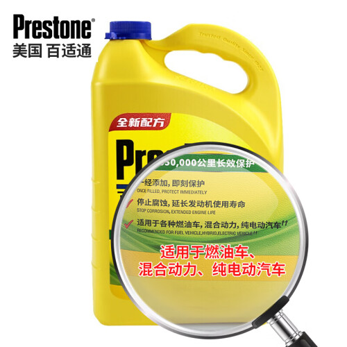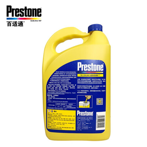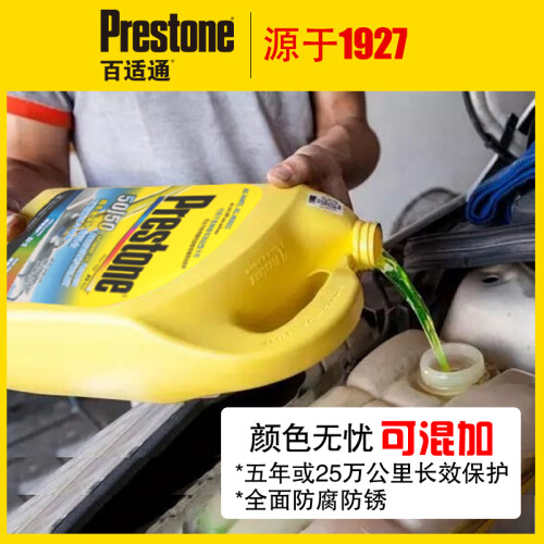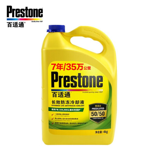 Prestone百适通是美国Honeywell霍尼韦尔旗下的汽车用品品牌。这款百适通50/50预混合长效防冻液,是百适通的旗舰系列产品,采用50%特质防冻液/冷却液和50%软化水(传热保护)混合而成,特殊的化学组分和配方技术,不含磷酸盐,硼酸盐和硅酸盐等,既延长了腐蚀抑制剂的寿命,又能为铝质和其它冷却系统金属部件提供长效保护。即用型配方即开即用,添加前不需清除原有防冻液和水,与任何类型或型号的汽车的任何防冻液兼容。容量3.78L。提供5年或25万公里保护,冰点-37℃,沸点129℃,适合国内大部分地区。