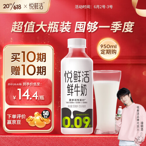 悦鲜活鲜牛奶 超瞬时杀菌鲜奶 950ml/瓶 低温奶 订奶 定期购 家庭装