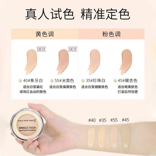 #40象牙白色(Creamy Ivory)适合白皙偏红肤色,#45玉瓷色(Warm Almond),适合暗黄肤色,打造自然妆感,#55粉嫩色(Blushing Beige)适合白皙偏黄肤色,#70自然色(Natural),#75麦芽色(Golden)适合自然暗哑肤色,#80棕红色(Bronze)。