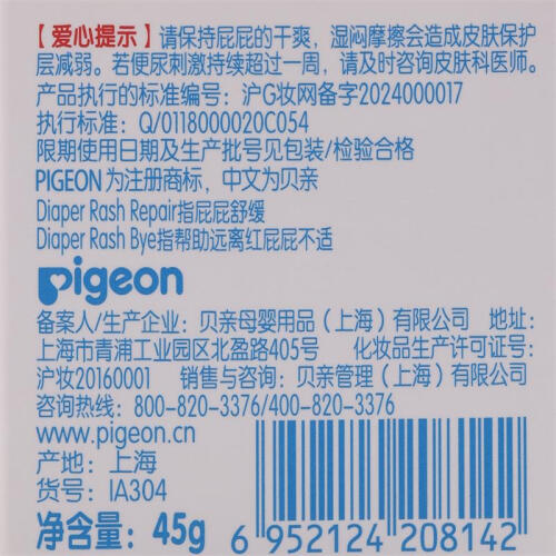 贝亲(Pigeon)婴儿植物舒缓护臀膏 屁屁霜 45g IA304