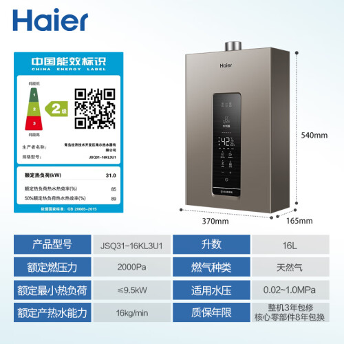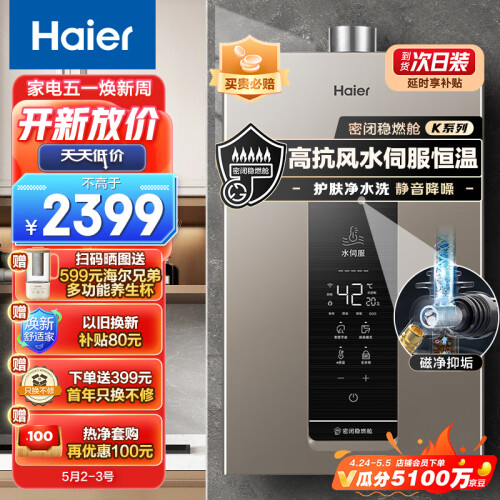 海尔(Haier)16升【K系列KL3】【国补换新立减15%】燃气热水器天然气水伺服恒温 全新密闭稳燃舱JSQ31-16KL3U1