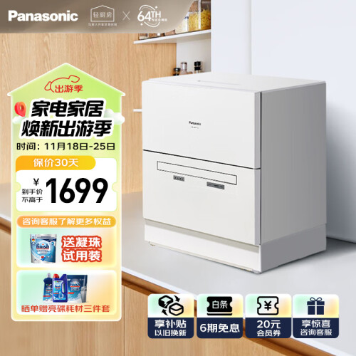 松下(Panasonic)洗碗机台式5套母婴家用小型易安装台面超薄自动刷碗机 25分钟快速洗 双层可移动碗篮 送风烘干 一代NP-K8RWH3R
