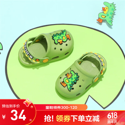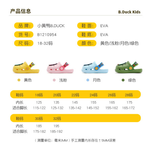 B.Duck小黄鸭童鞋儿童拖鞋夏季男童透气洞洞鞋女童可爱卡通家居鞋 913绿色 22 码 脚长13.5-14.2cm