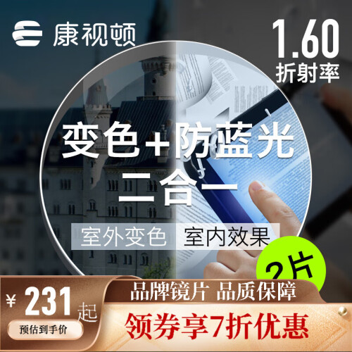 康视顿镜片 高清透明镜片防蓝光变色 近视非球面眼镜片2片 1.60膜层变色+防蓝光(送镜架) 武汉26家实体店