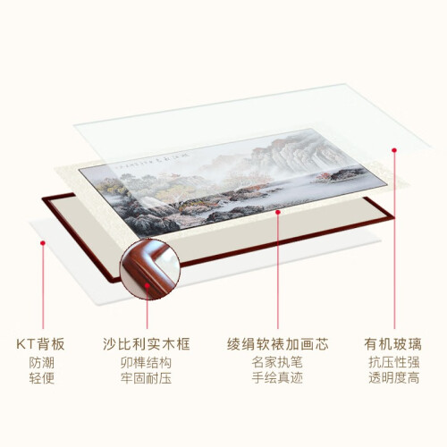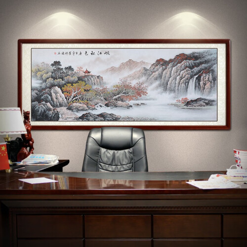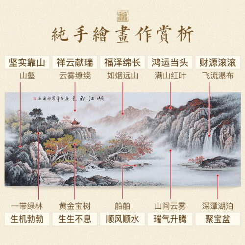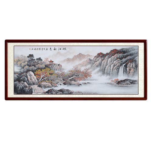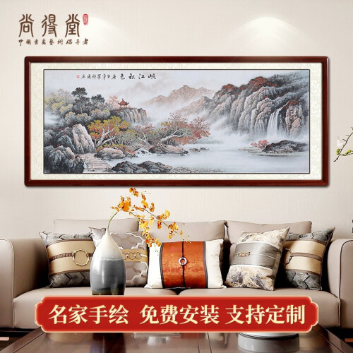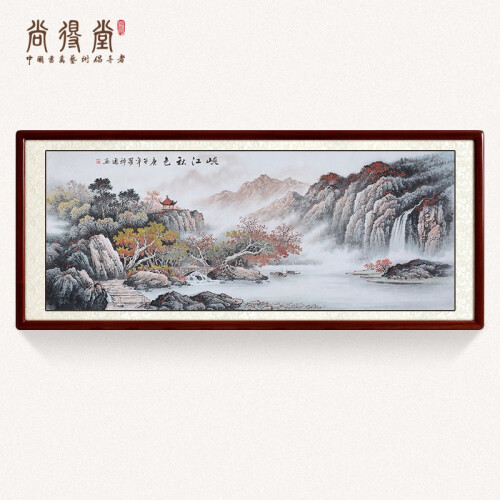 尚得堂名家手绘国画山水画客厅装饰画字画办公室挂画峡江秋色水墨画 沙比利实木框-圆角棕色 218cm*88cm (推荐)