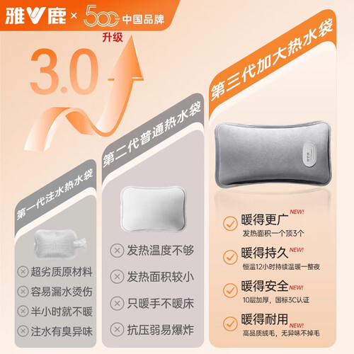 雅鹿【暖被窝专用】长条热水袋充电暖手宝兔毛绒睡觉暖脚神器防爆暖宫 【加大加长型】冰川灰丨暖床专用3C认证