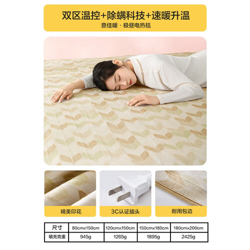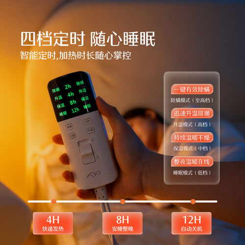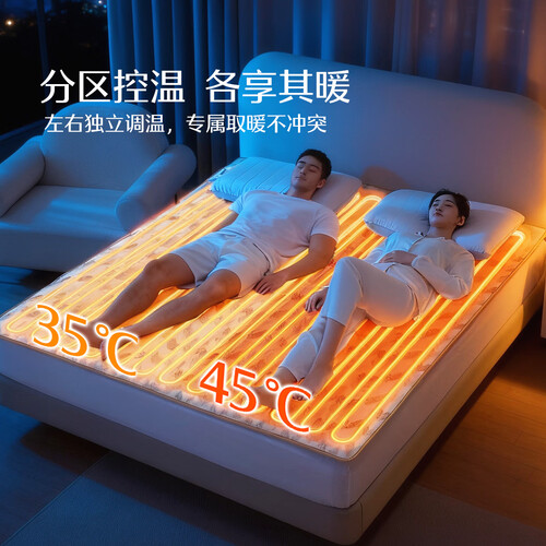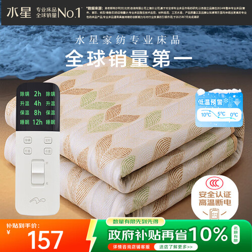 水星家纺【高温断电】双人电热毯1.5米x1.8米双温双控电褥子定时除螨排湿