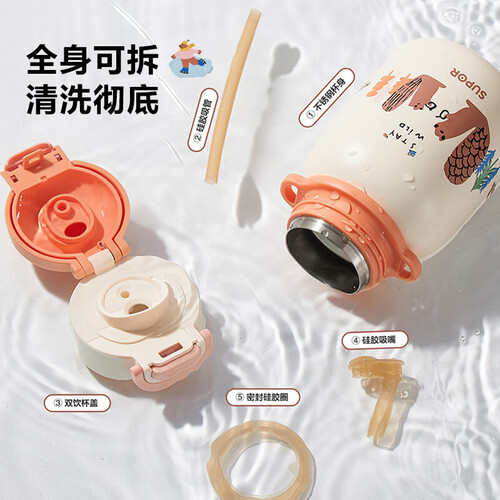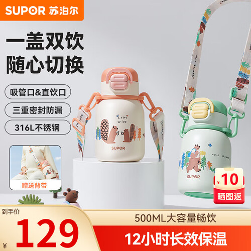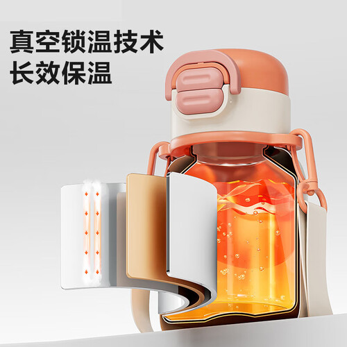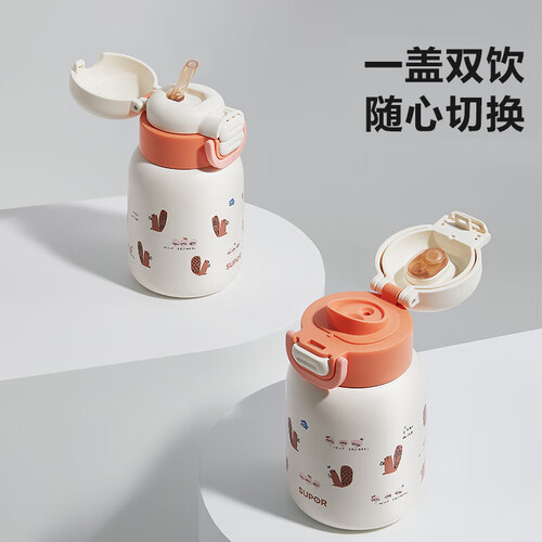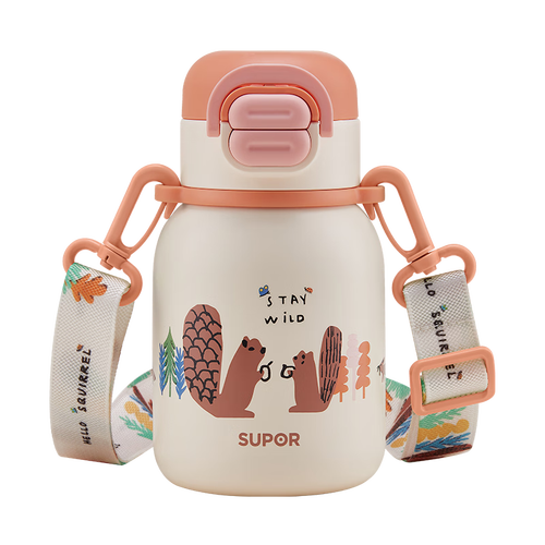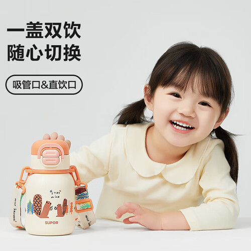 苏泊尔(SUPOR)儿童保温杯男女孩学生水杯水壶316L不锈钢便携吸管杯大容量学饮杯 【背带款】一盖双饮 嫩柚粉 500ml