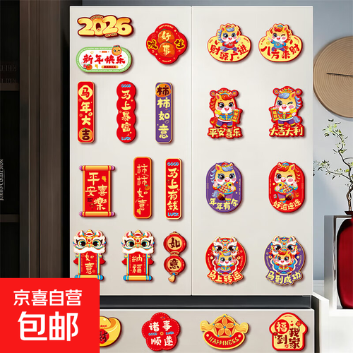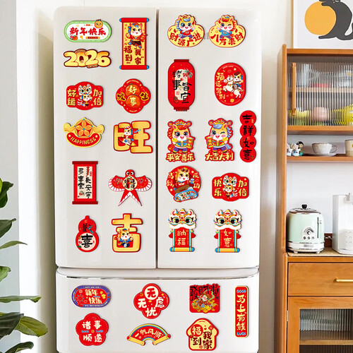 2026马年新款磁吸冰箱贴新年装饰品卡通春节创意民俗氛围磁贴 马上有钱+马上转运+纳福如意(24个装)