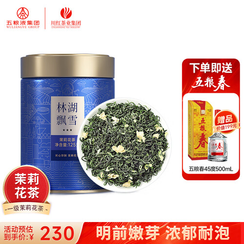 川红 特级飘雪花茶 茉莉花茶叶125g 【有赠品】 送45度500ml