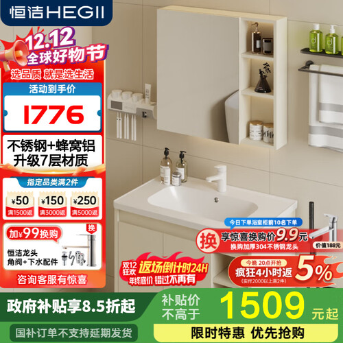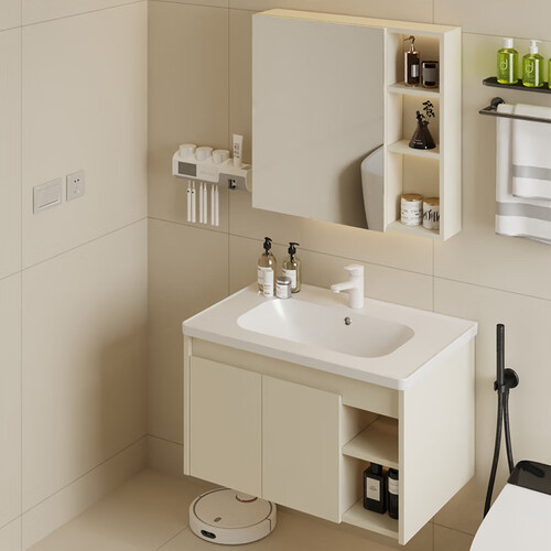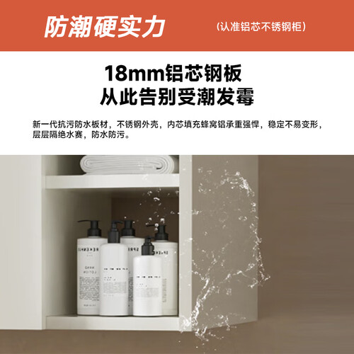 恒洁金属柜2.0七层铝合金不锈钢大储物防霉防潮陶瓷一体盆浴室柜6106 【81cm美妆收纳镜柜】浅杏