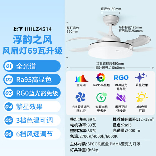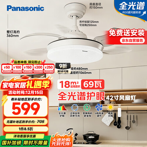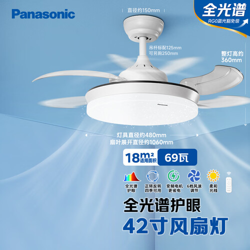 松下(Panasonic)风扇灯全光谱卧室餐厅吊扇灯69瓦灯具 餐厅风扇灯42寸【包安装】