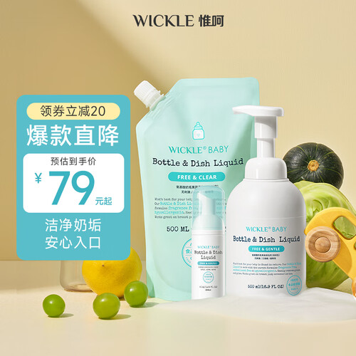 WICKLE氨基酸奶瓶清洗剂果蔬水果清洁剂婴儿宝宝用品奶嘴清洗液水果 【推荐】1瓶+补充装1袋