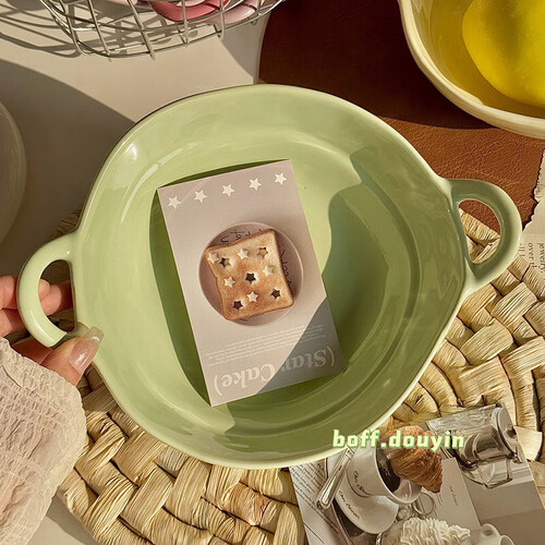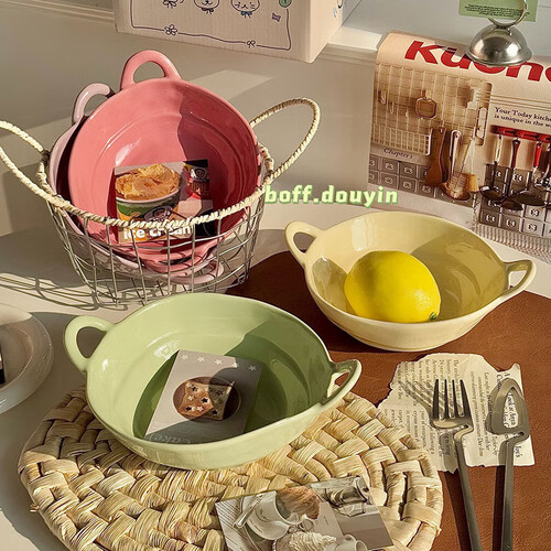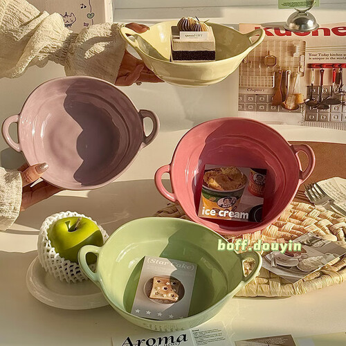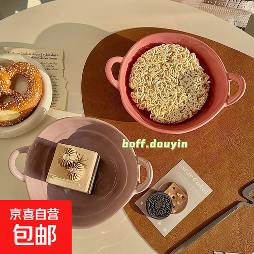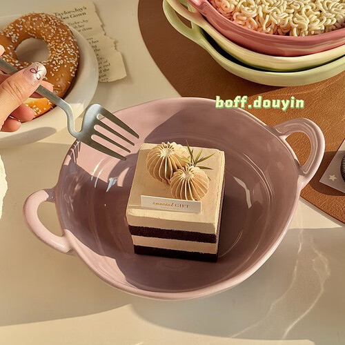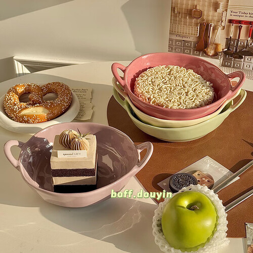 - 陶瓷手捏不规则双耳碗水果沙拉碗泡面碗家用宿舍学生餐具螺蛳粉 【芋泥紫+树莓粉】双耳碗各一