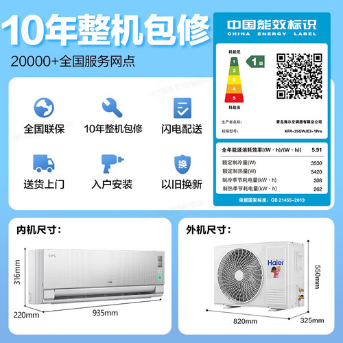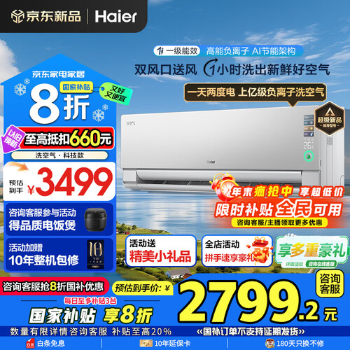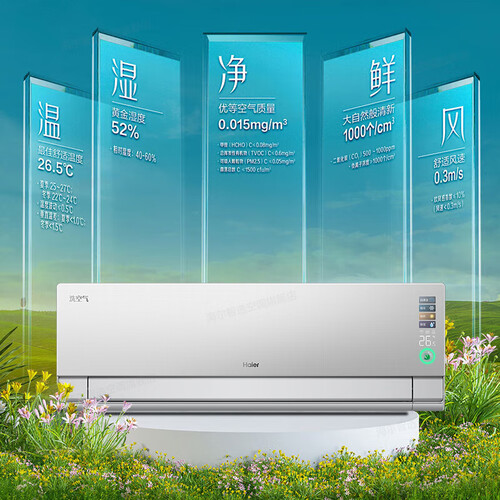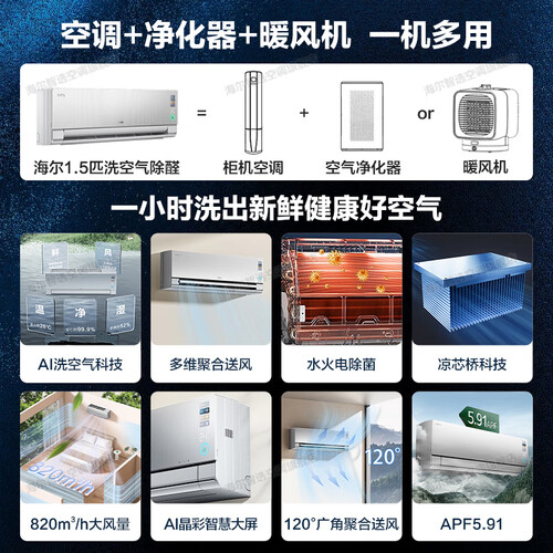 海尔空调洗空气Pro 1.5匹新一级变频冷暖卧室壁挂式声源定位送风 聚合双向风智慧除湿 高能负离子除醛 1.5匹 一级能效洗空气+净化空气+除空气污染物