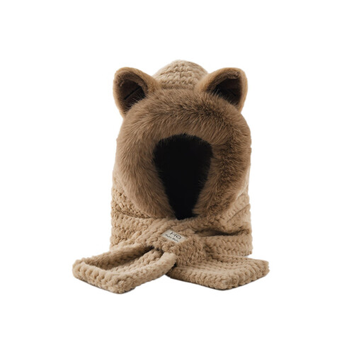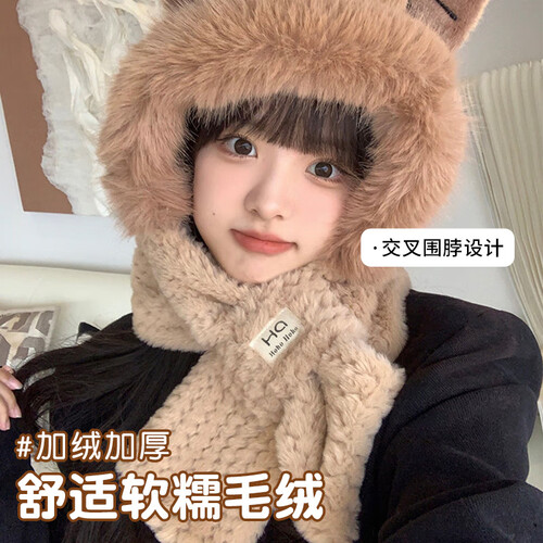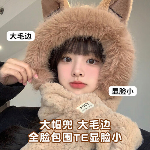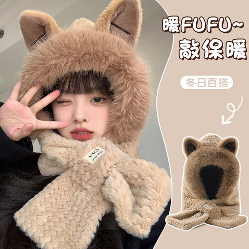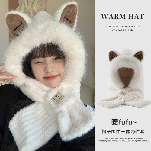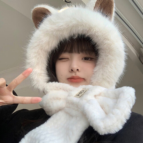 - 三合一毛绒加厚围巾帽子女秋冬可爱百搭猫咪耳朵保暖护耳包头潮帽 狐狸款(米 白)围巾帽