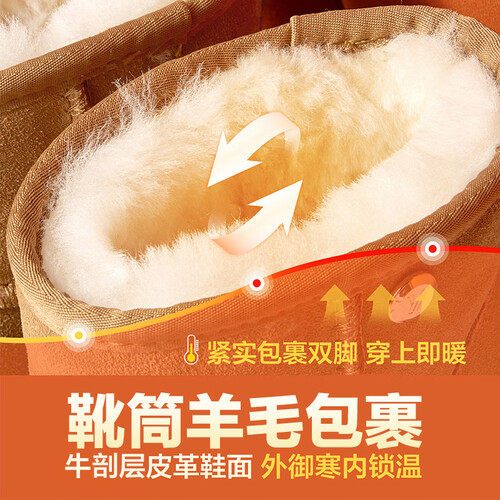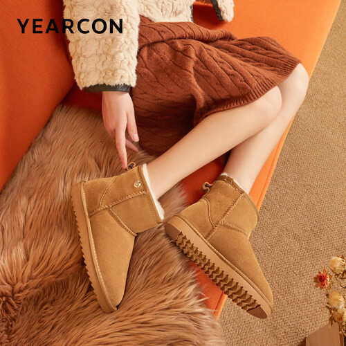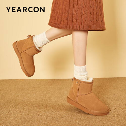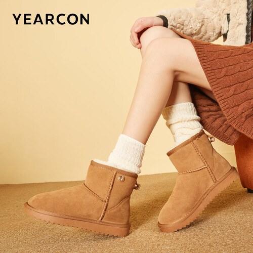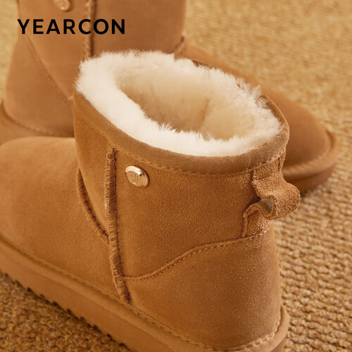 意尔康女靴雪地靴女士加绒加厚保暖棉鞋舒适百搭东北抗寒中筒靴子 土黄色 加绒 35