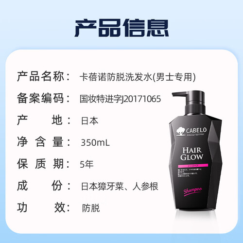 卡蓓诺(CABELO)防脱洗发水控油清爽调理头皮油脂男士防脱发适用【日本原装进口】 【男士防脱发】无硅油配方 防脱洗发水 350ml*1